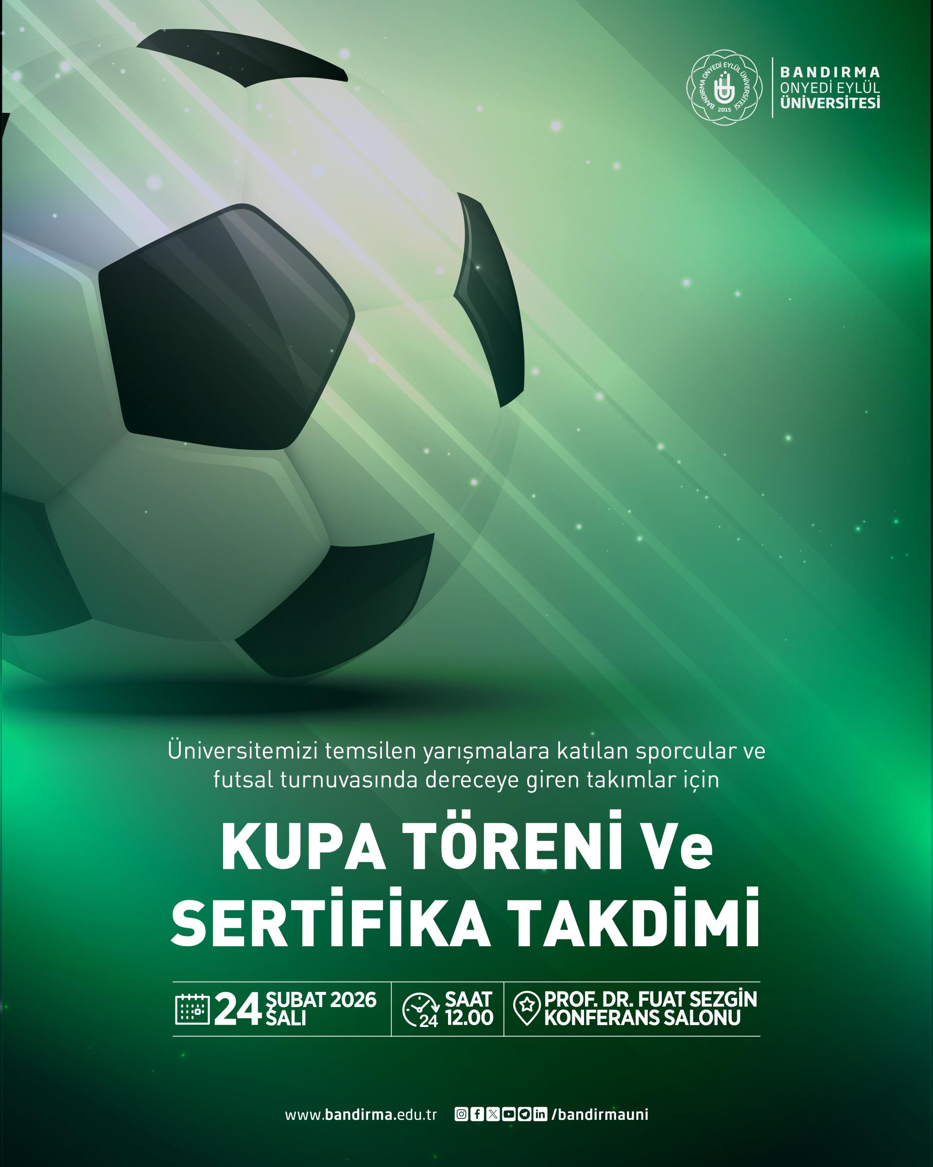 Üniversitemizi 2025 Bahar Dönemi – 2026 Güz Dönemi TÜSF faaliyetlerinde başarıyla temsil ederek derece kazanan öğrencilerimizi onurlandırmak, sportif faaliyetlerini desteklemek amacıyla ve düzenlenen Kurum Personeli Futsal Turnuvası kapsamında kupa ve sertifika töreni gerçekleştirilecektir.