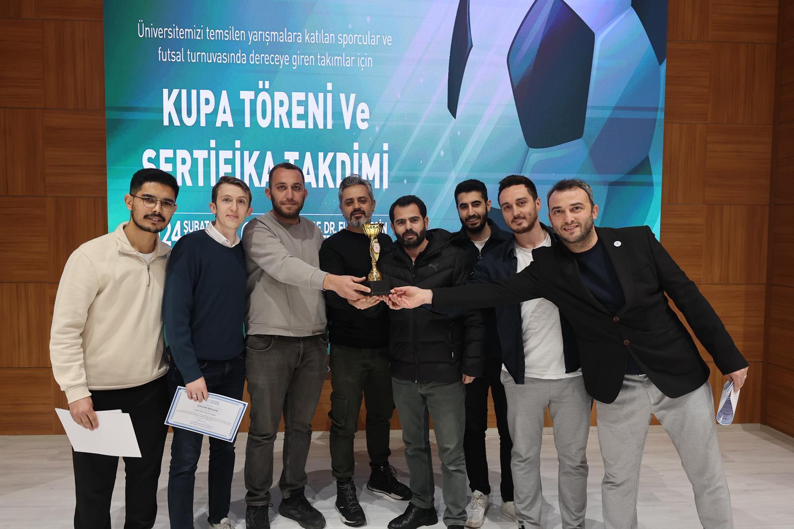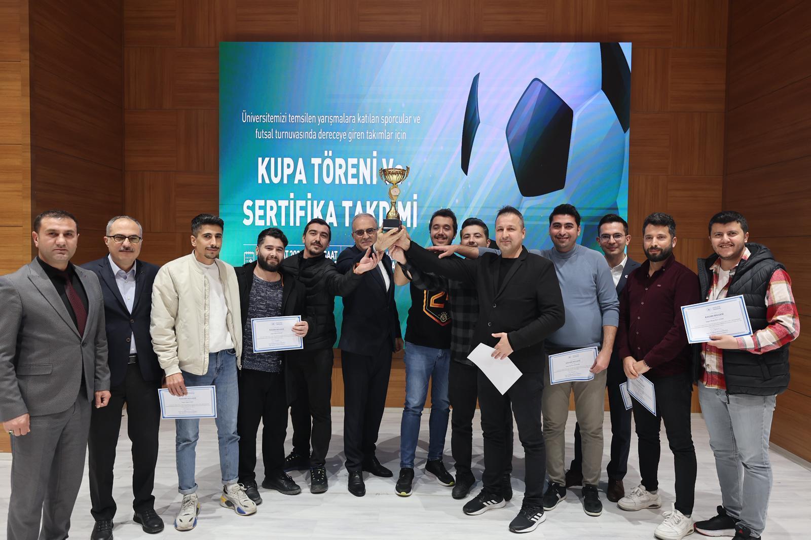 Üniversitemizi temsilen çeşitli yarışmalara katılarak derece elde eden sporcularımız ile kurum personellerimiz arasında düzenlenen Futsal Turnuvası’nda dereceye giren takımlarımız için, bu yıl ikincisi gerçekleştirilen ve ilerleyen yıllarda da gelenekselleştirilmesi hedeflenen “Kupa Töreni ve Sertifika Takdimi” programı, Sağlık Kültür ve Spor Daire Başkanlığı koordinasyonunda düzenlendi.