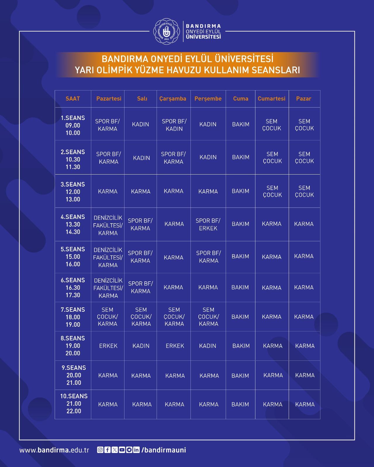 Bandırma Onyedi Eylül Üniversitesi Spor Vadisi yerleşkesi içerisinde yer alan yarı olimpik yüzme havuzu, üniversitemiz öğrencileri, akademik ve idari personeli ile misafir kullanıcıların hizmetine sunulmuştur.